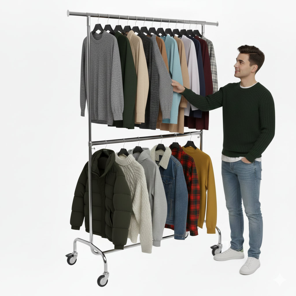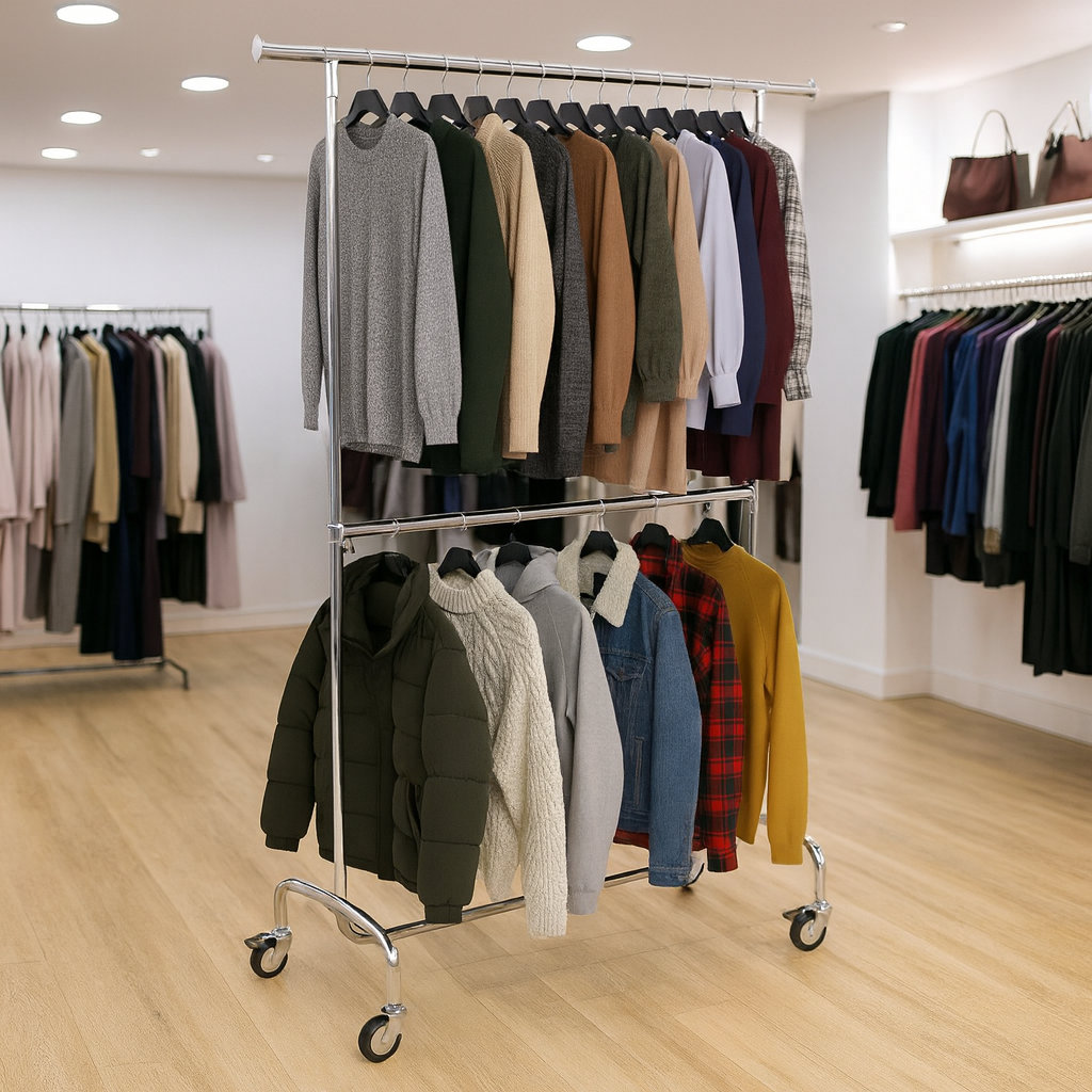 - Contenu de la livraison: penderie de vente incluant 4 roues pivotantes