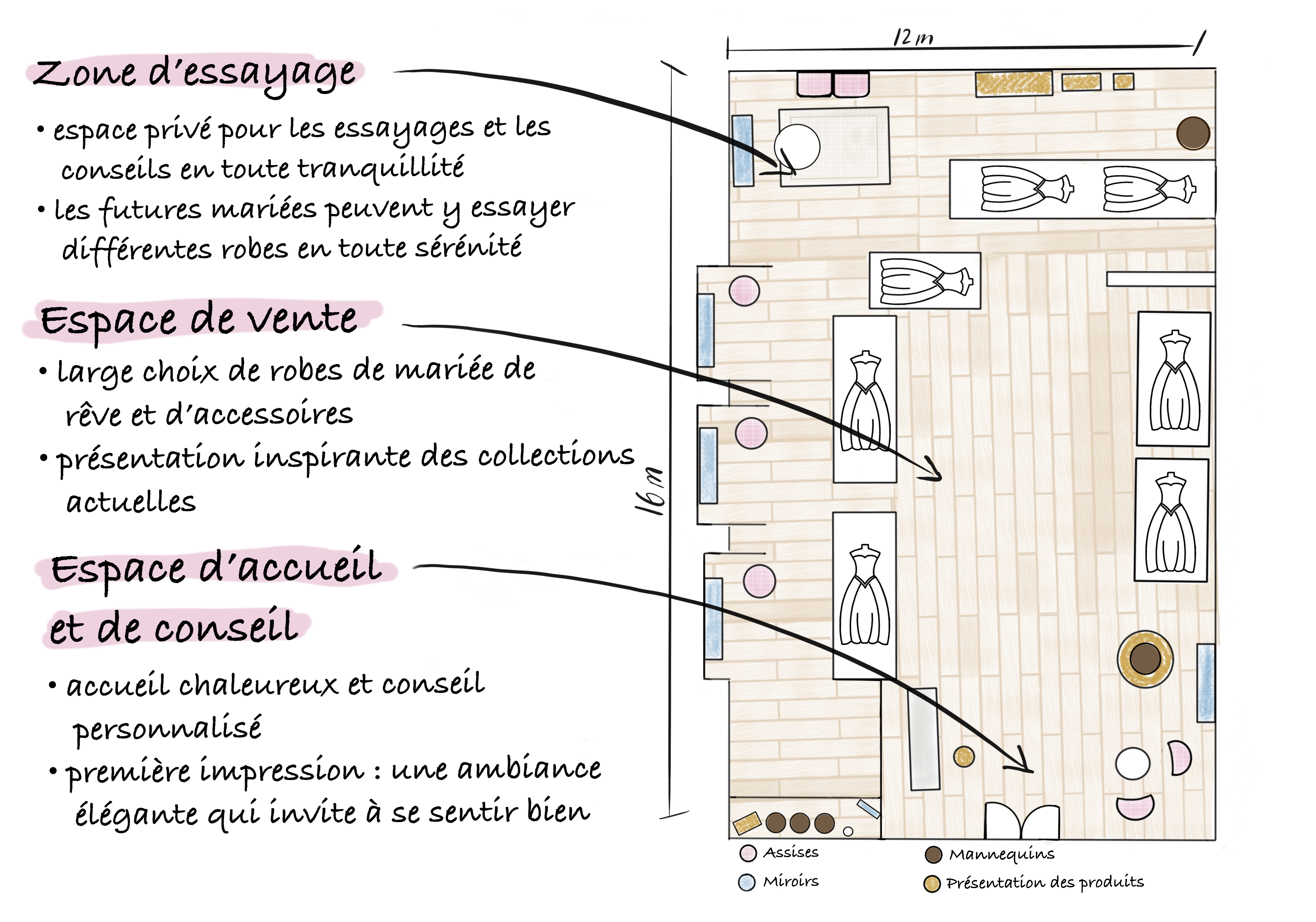 Le croquis ci-dessous illustre un exemple de zonage pour une boutique de robes de mariée au style Shabby Chic. Il vous aide à exploiter au mieux votre surface – avec esthétique, fonctionnalité et sens du client. Tous les éléments présentés sont modulables et peuvent être associés à nos solutions d’aménagement sur mesure.
