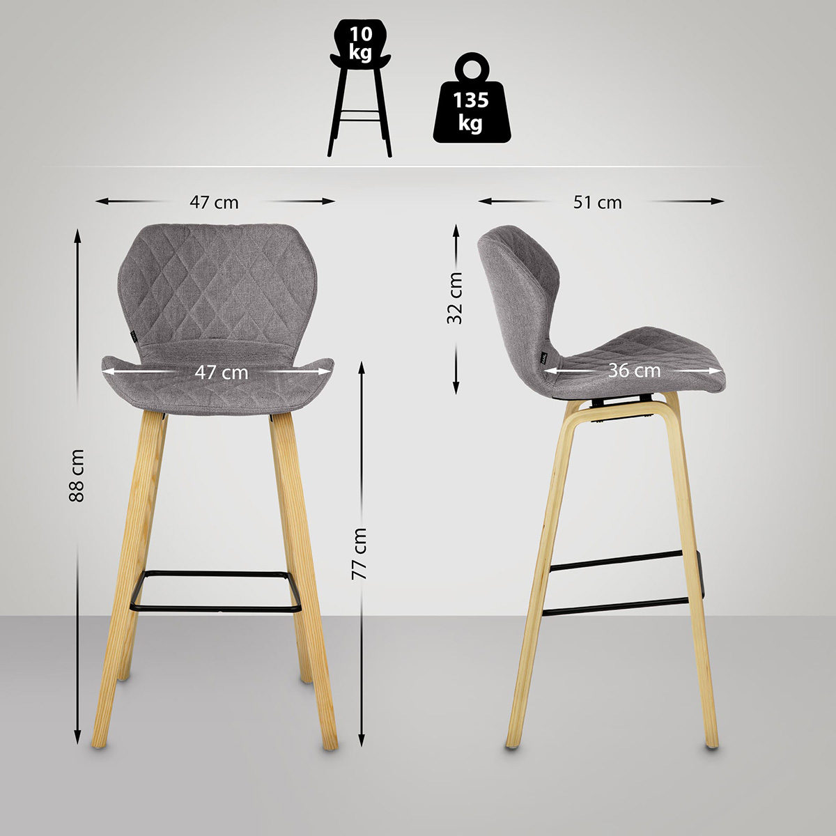 Ce même piètement à quatre pieds en bois stable garantit la stabilité de la chaise. La chaise de bar peut supporter sans problème une charge de 135 kg. Grâce aux protections de sol sous les pieds de la chaise, les sols sensibles ne sont pas endommagés.