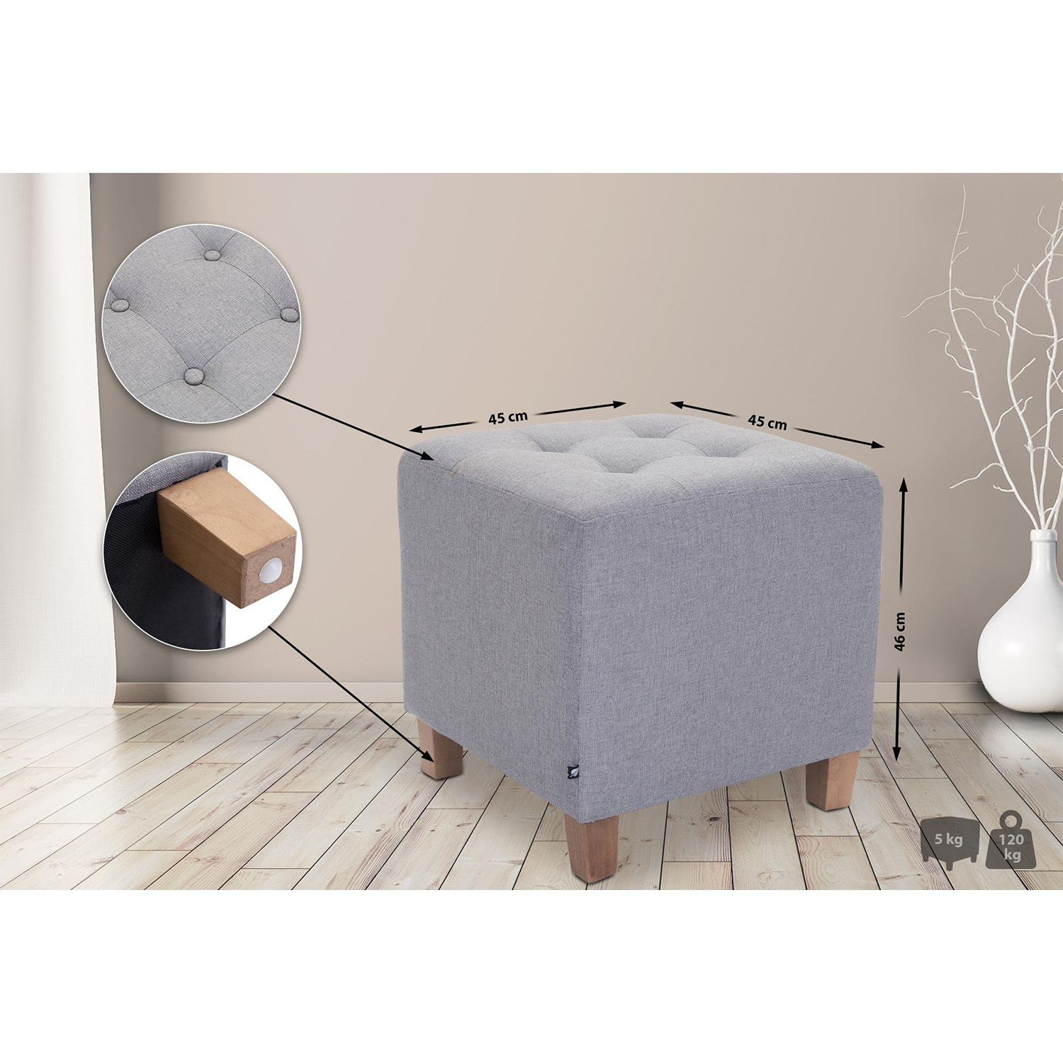 - Polyvalent – utilisé comme tabouret, repose-pieds ou élément de décoration élégant