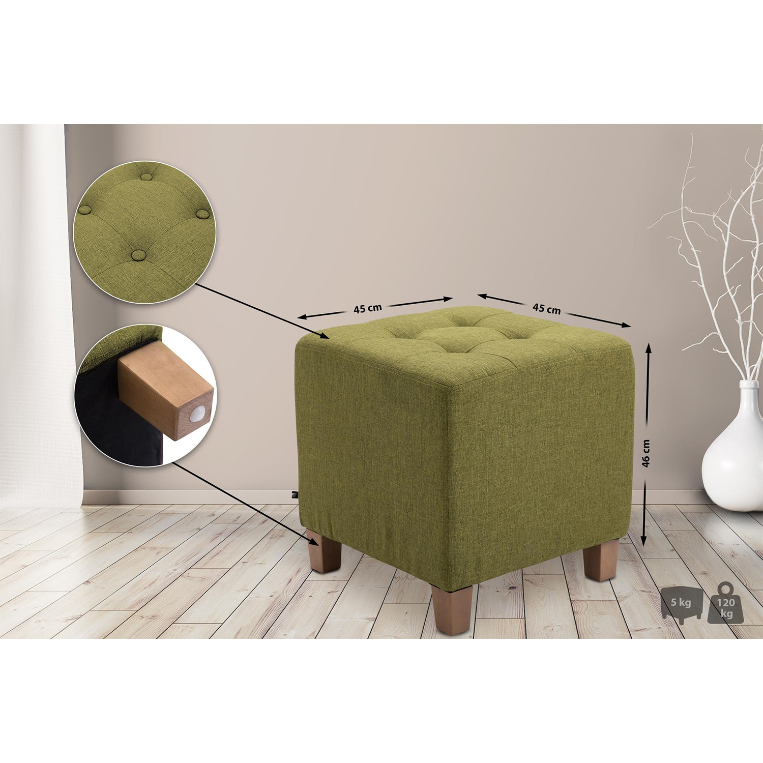 - Polyvalent – utilisé comme tabouret, repose-pieds ou élément de décoration élégant